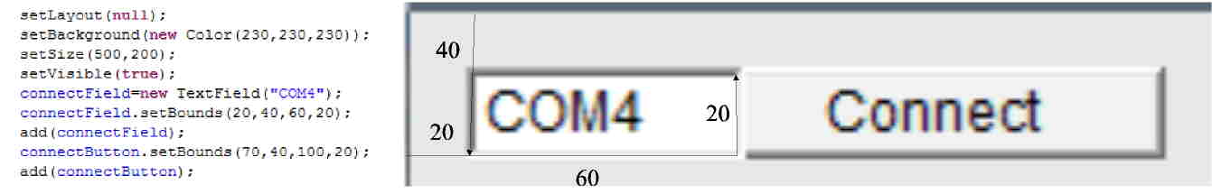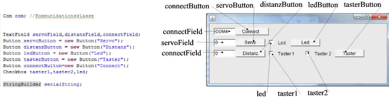else if ((event.target == distanzButton)){ String serielEingang=new String(); String input; sendData("A"); serielEingang=receiveData('A'); input=serielEingang.substring(1); distanzField.setText(input); return true; } |