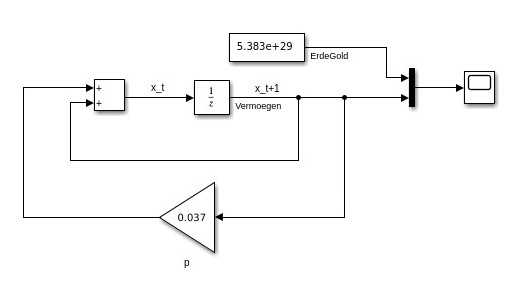 Regelungstechnisch kann man das Konto als ein Summierer darstellen. Ein einmal eingezahltes Geld bleibt erhalten. Es gibt noch eine positive Rückkopplung der Zins. Abhängig vom Kontostand kommt der Zins (Proportionalglied) dazu. Für den Zins gibt es wieder Zinseszins. Das folgende Schaubild zeigt das grafisch: