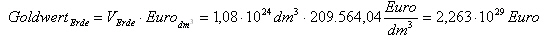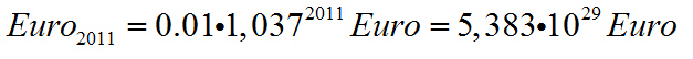 In den Medien wird oft von der Kernschmelze des Finanzsystems geredet. Der Mechanismus bei der Kernschmelze ist, das ein Atom gespalten wird und drei Neutronen freigesetzt werden. Diese treffen auf andere Atome und führen so zu einer Kettenreaktion. Das geht schnell und richtet großen Schaden an. Die Zinsfunktion ist auch eine Exponetialfunktion. Es geht aber deutlich langsamer von statten. Wenn Josef zu Jesus Geburt einen Cent zurückgelegt hätte und er bei 3,7 % verzinst hätte wäre das Guthaben so groß, das er die Erde in Gold dafür kaufen könnte. Unten ist die Berechnung aufgeführt. Dem Guthaben auf der einen Seite, stehen Schulden auf der anderen Seite gegenüber. Es ist nicht so wie beim Josefcent, daß einmal eingezalt wird und dann nicht mehr. Heute sind es Billionen, die exponentiel wachsen. Die Rettungsschirme werden immer größer. Der Bankenrettungsschirm garaniert für 400 Mrd Euro. Der Rettungsschirm für Staatsanleihen beträgt 750 Mrd Euro. Die Staatshaushalte sind da schon fast klein dagen. Haushalt der BRD 2010: