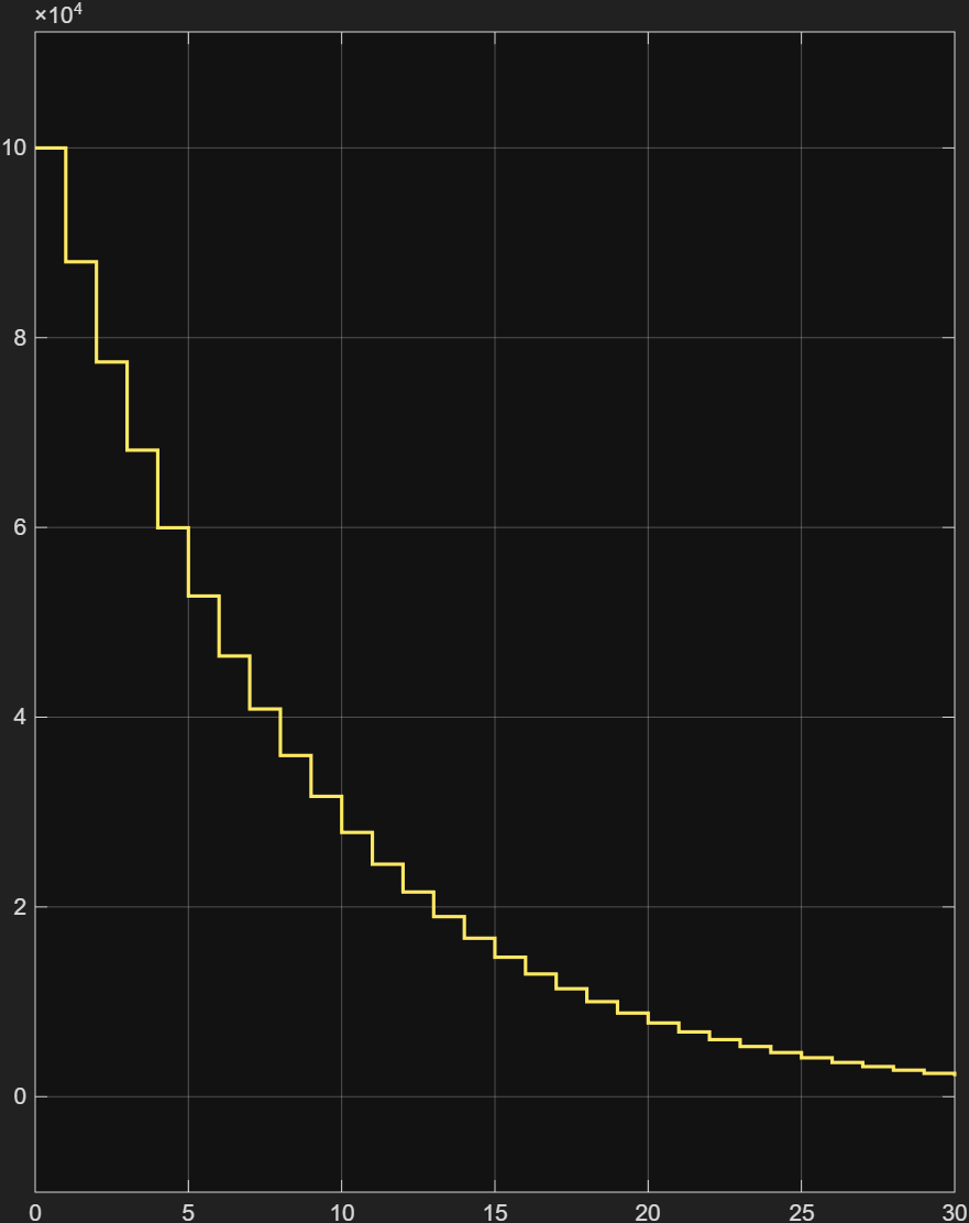 \[ \begin{aligned} x_{t} &: \text{Kapital zum Zeitpunkt t} \\ x_{0} &: \text{Anfangskapital} \\ s &: \text{Steuer als Dezimalzahl} \\ p &: \text{Zins als Dezimalzahl} \\ t &: \text{aktuelles Jahr} \end{aligned} \] Beim Faktor (1 - s + p) ist die 1 für das Summieren zuständig und das s ist eine negative Rückkopplung durch den Steuersatz. Es gibt eine positive Rückkopplung durch den Zins p.Es gibt eine Schleife über n = 30 Jahre. Die ersten Jahre sind unten gezeigt:
