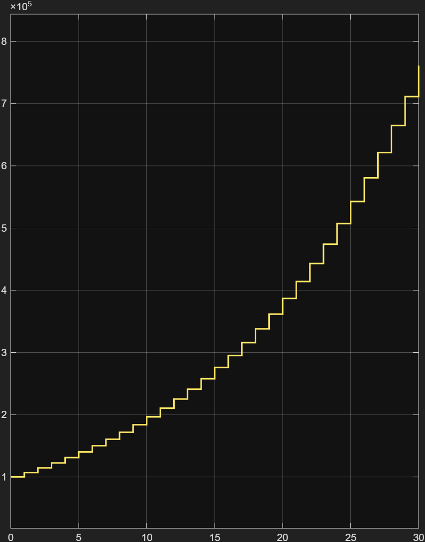 \[ \begin{aligned} x_{t+1} &: \text{Kapital nach einem Jahr} \\ x_{0} &: \text{Anfangskapital} \\ x_{t} &: \text{Kapital zum Zeitpunkt t} \\ p &: \text{Zins als Dezimalzahl} \\ t &: \text{aktuelles Jahr} \end{aligned} \]MATLAB Online ist die Browser-Version von MATLAB. Damit kann man Simulink Modelle öffnen und bearbeiten.