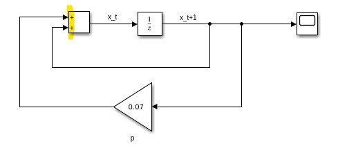 1/z ist eine Zeitverzögerung. Links ist x_t und rechts x_t+1. x_t wird mit (1 + p) rückgekoppelt. Der Summierer ist gelb markiert. Die 1 kommt vom Summierer. p ist der Zins.