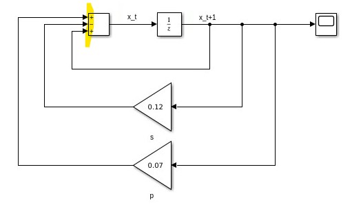 Man sieht, dass die Werte größer werden. (1 - s + p) = (1 - 0.01 + 0.07) = 1,07 > 1. Das System ist instabil.
