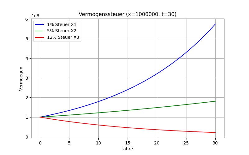 Bei 1 % Steuer wächst das Vermögen exponentiell. Bei 5% Steuer wächst das Vermögen nicht so schnell. Bei 12 % schrumpft das Vermögen. Es ist aber stabil.