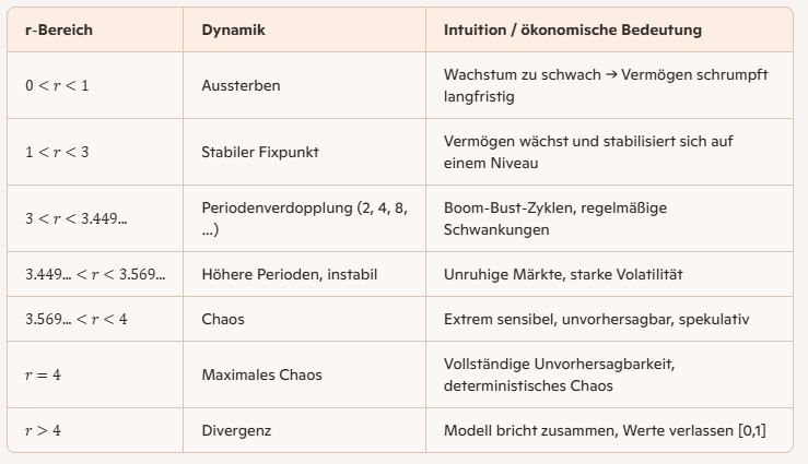 Wenn man den Radiobutton auf Once stellt, kann man mit dem Slider einen r-Wert einstellen. In der unteren Tabelle gibt es Informationen zu den r-Werten. Ein Bild darunter ist das Feigenbaumdiagramm, in dem verschiedene r-Werte aufgetragen sind.
